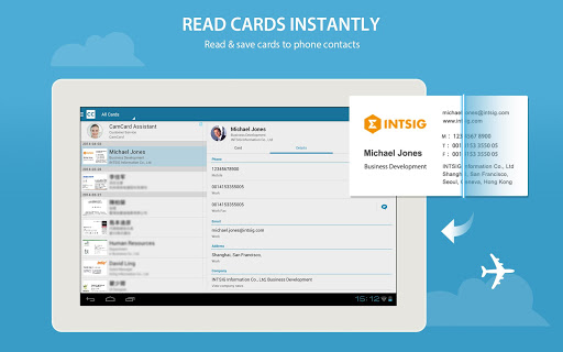 CamCard reads business cards and save instantly to phone Contacts. It syncs all your cards across smartphones, tablets, computers and the